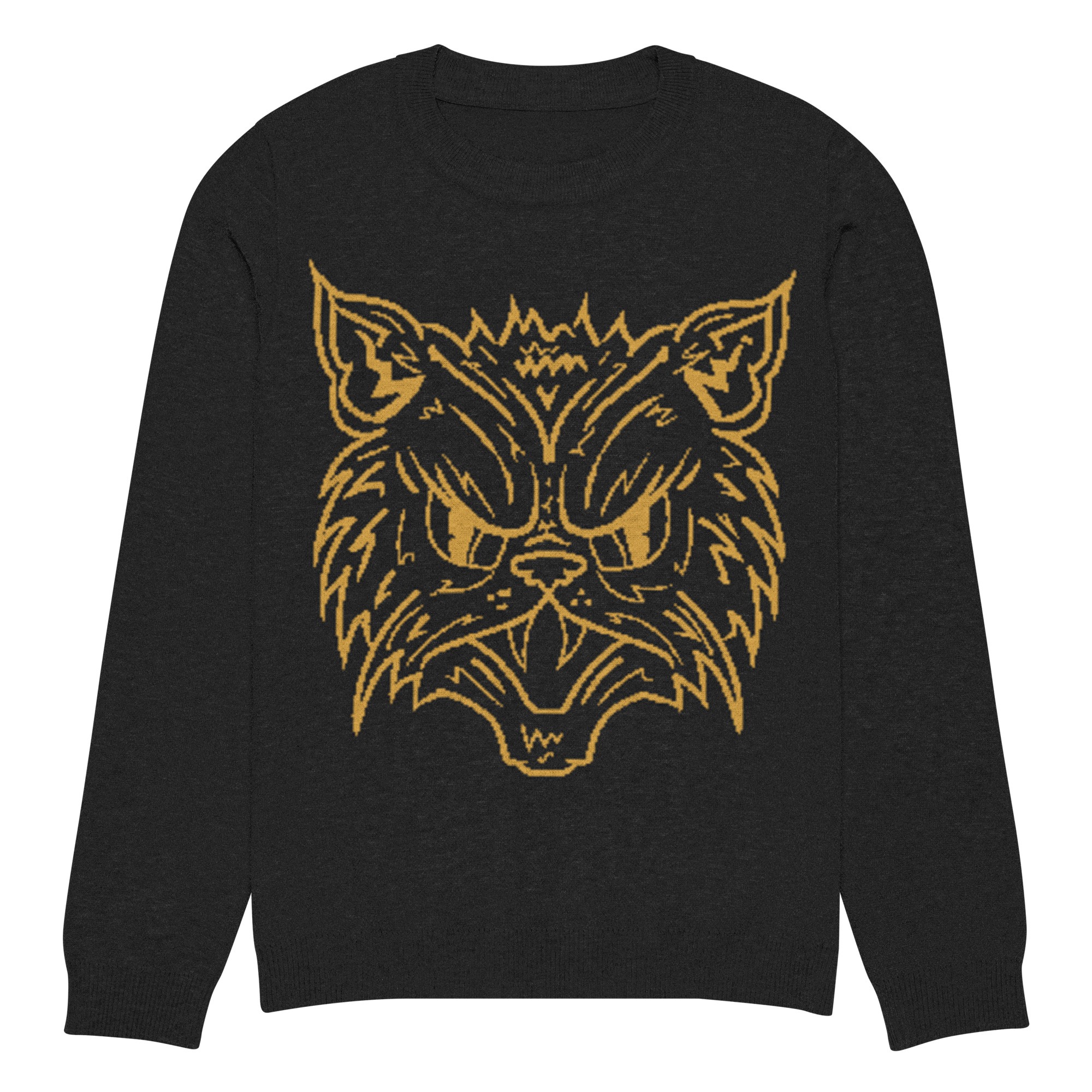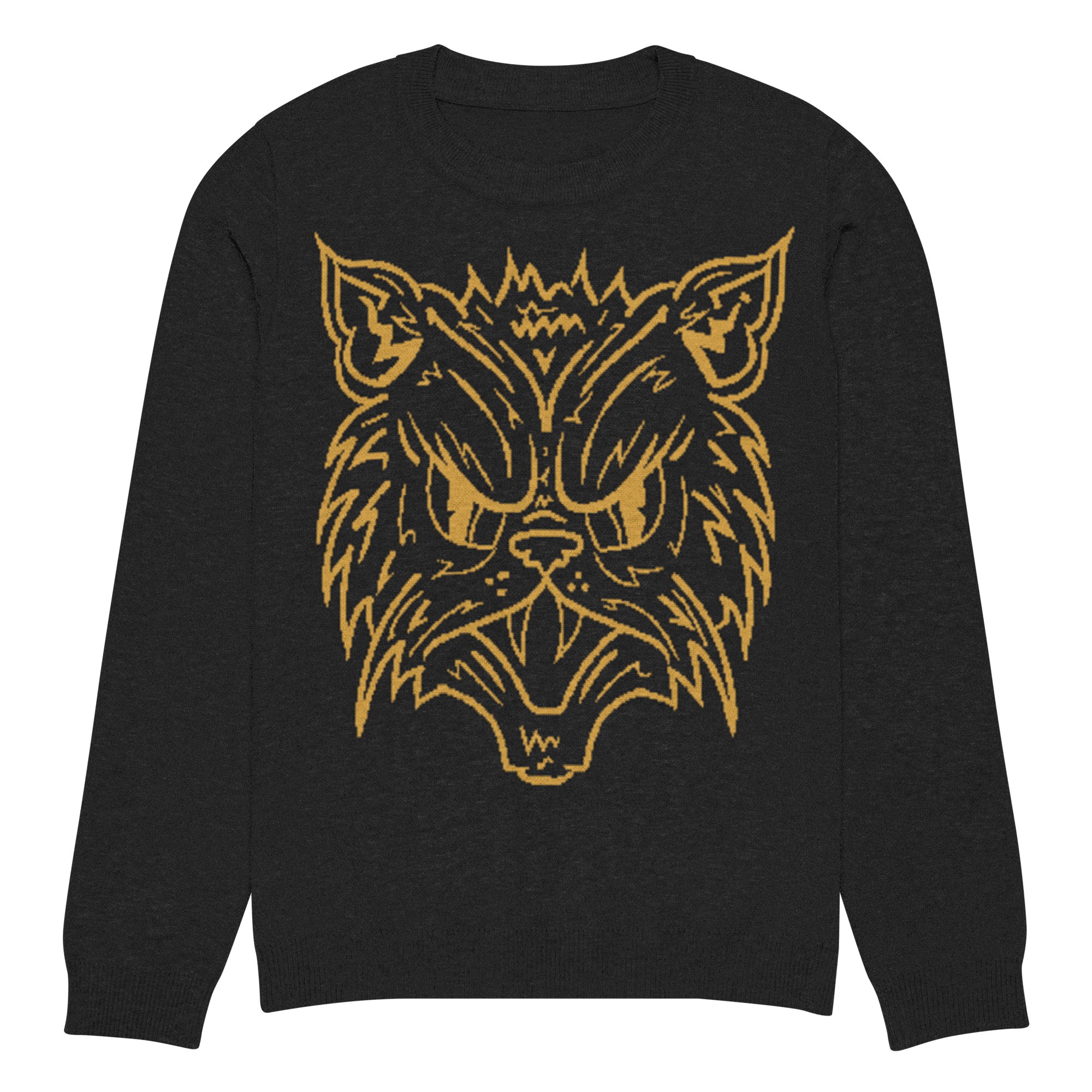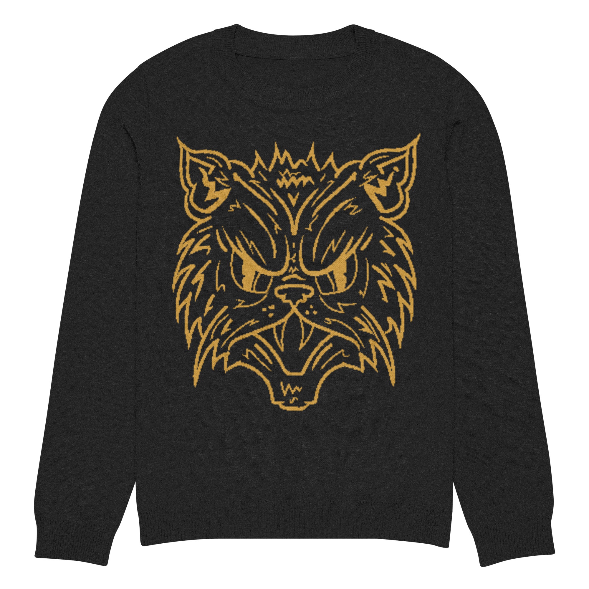 Our Black Cat Illustration in orange, on a black knitted crew neck sweater.